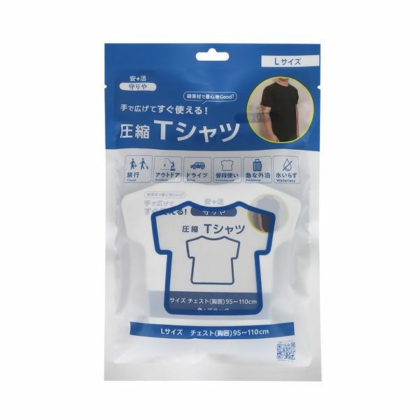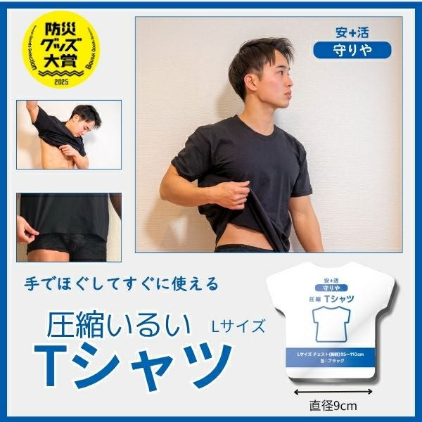 本製品は、Lサイズ(胸囲約95㎝~110㎝)のTシャツを、直径約90mmというコンパクトサイズに圧縮した便利な携帯用ウェアです。手のひらに収まるサイズ感で、持ち運びや備蓄にも最適です。