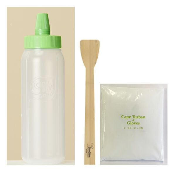 ヘナ染めに便利なボトルとケープターバン、手袋、ヘラのセットです。