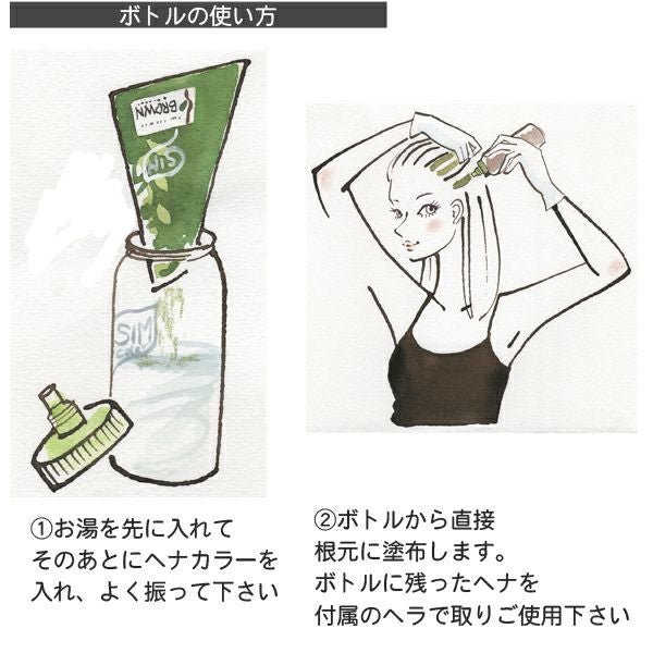 最初にお湯を注ぎ、その後ヘナを入れ、よく振って下さい。
