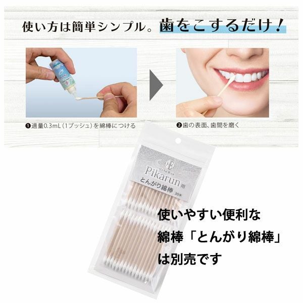 ①適量0.3mL(1プッシュ)を綿棒などにつける ②歯の表面、歯間を磨く(使用後、口をすすぐ必要はありません)